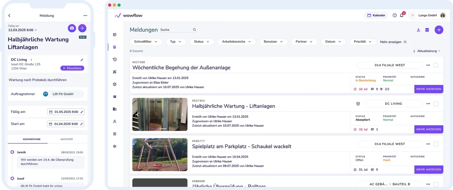- Wartungsplanung und Instandhaltung: Automatische Delegierung und Überwachung geplanter Wartungsaufgaben an interne Techniker oder Dienstleister.