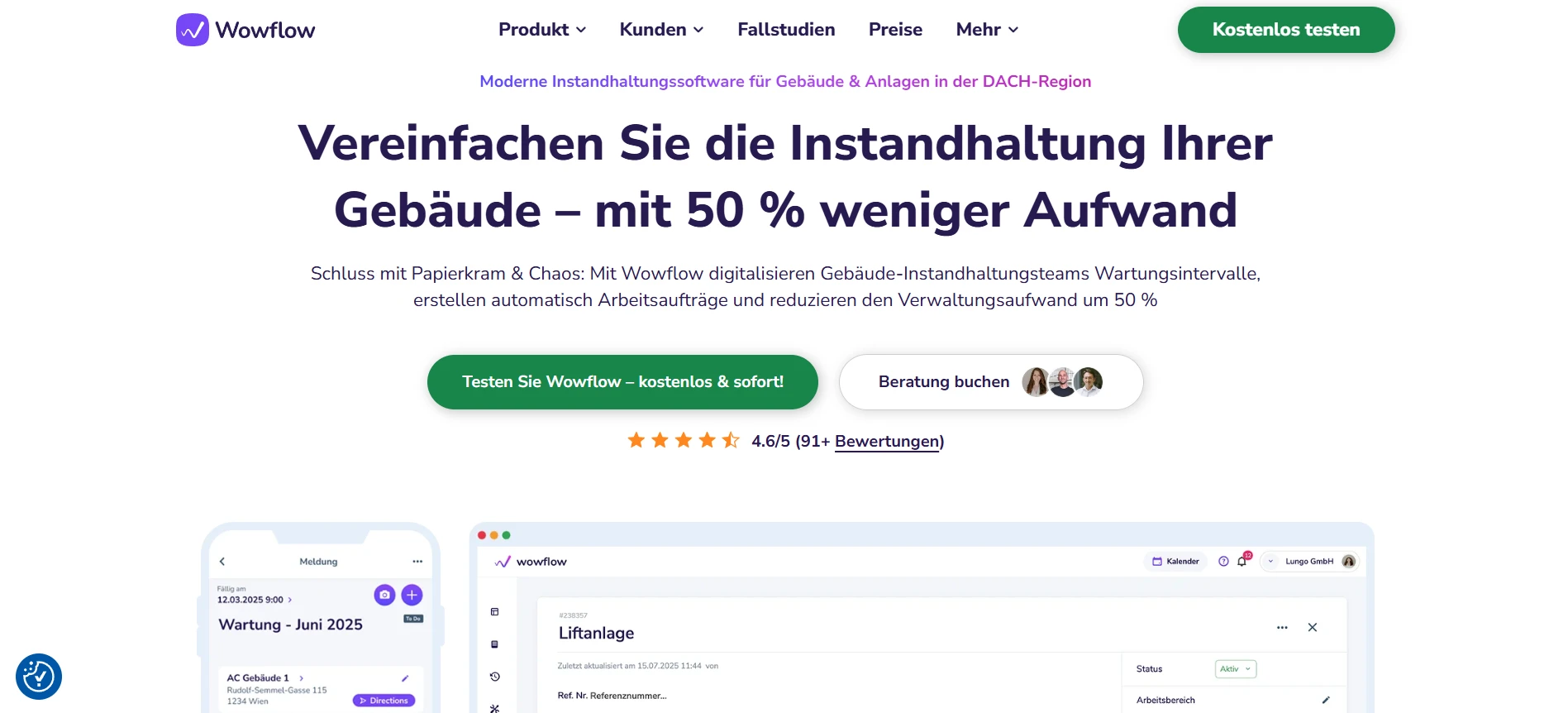| Wowflow | Facility Management, Gebäudeservice & Facility Services | 0 € (für Auftraggeber / Dienstleister), 39,90 € (für Mitarbeiter), 99,90 € (für Manager / Admins) | Ja, für 14-30 Tage | Für moderne Instandhaltungsteams, die mit externen Dienstleistern zusammenarbeiten müssen |