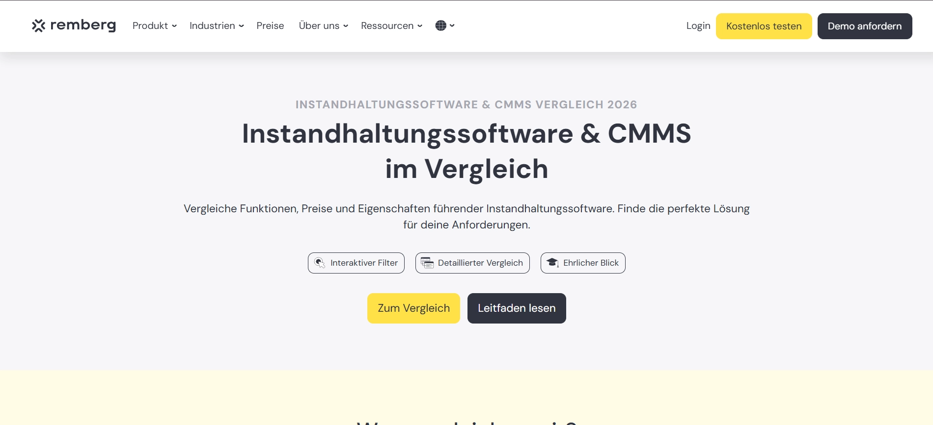 Remberg è un software CMMS incentrato sulla manutenzione industriale, sulla gestione delle macchine e sui processi di manutenzione supportati dall’intelligenza artificiale. La piattaforma si rivolge alle aziende di produzione che vogliono valutare sistematicamente i dati di manutenzione e controllare in modo efficiente le misure di manutenzione con l’aiuto dell’automazione e delle integrazioni.