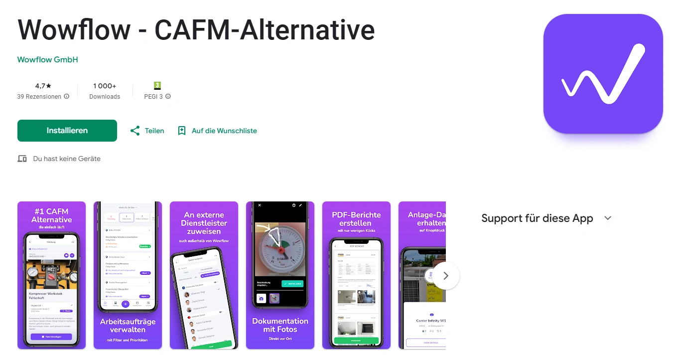 | Wowflow | Ticketing, Anlagenverwaltung, einfache Checklisten | Ab 39 Euro | Moderne Facility-Management-Teams | Ja |