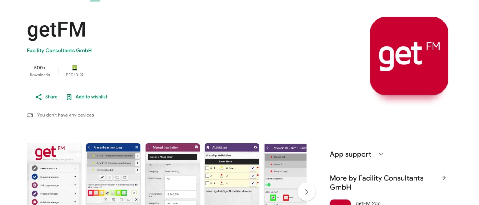 | GetFM | Mobile Dokumentation & Kontrollen | N/A | CAFM-Nutzer mit mobilem Außendienst | Ja |